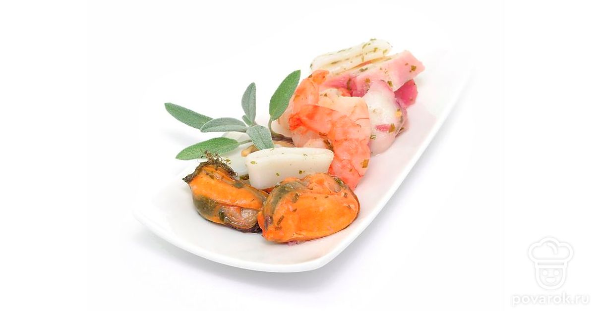 Коктейль из морепродуктов в рассоле — консервированные кальмары, осьминоги, мидии и креветки. Используется для приготовления салатов и начинок для пирогов.