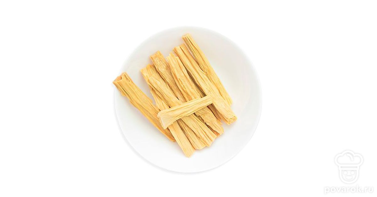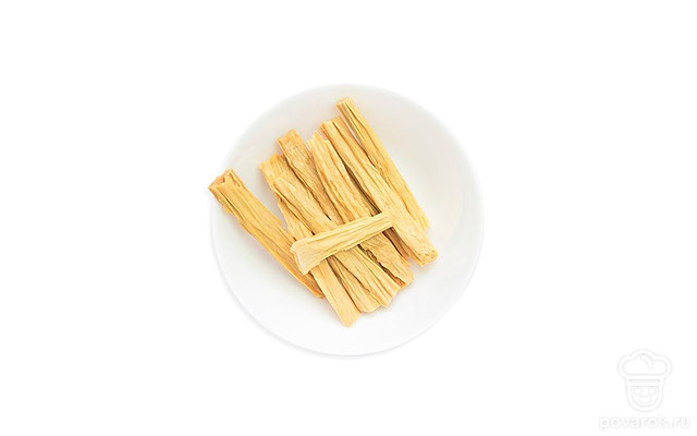 Сухая соевая спаржа — это небольшие жгутики кремового цвета. Волокнистая, внешне напоминает засушенные кусочки рыбного филе. Вкус нежный, нейтральный.