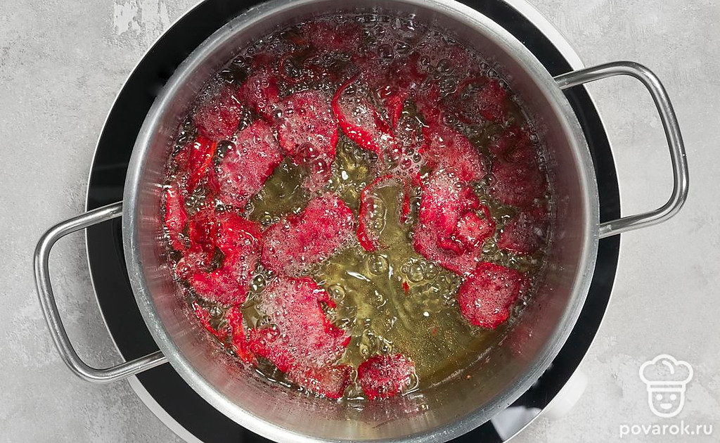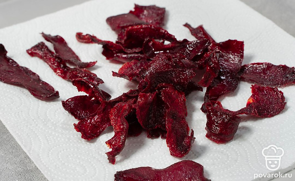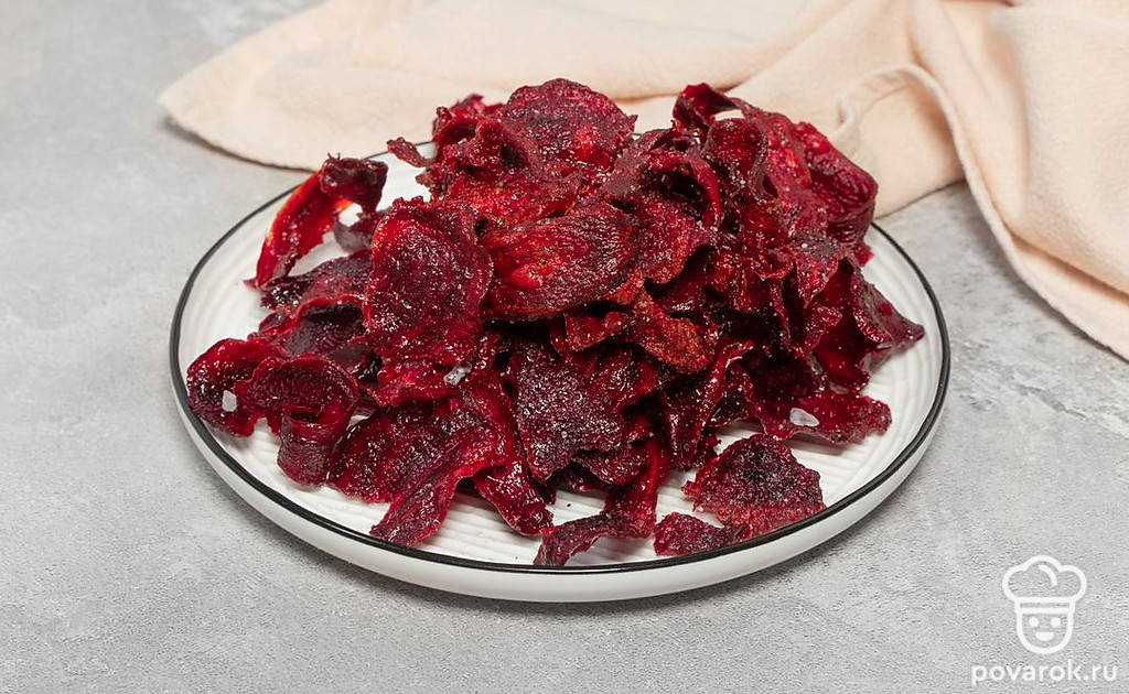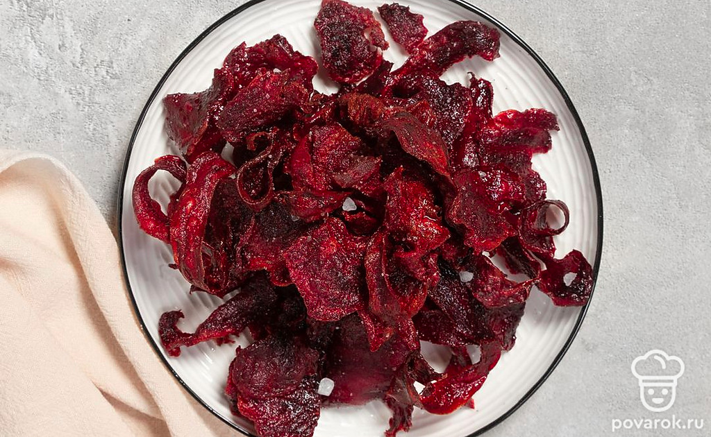 Свекольные чипсы готовятся так же, как и картофельные. Они получаются очень хрустящими и вкусными. Можете взять любой сорт свеклы: красную, розовую или золотистую. Очень красиво будет смотреться жареная полосатая свекла. Самое главное — нарезать ее как можно тоньше. Воспользуйтесь для этого слайсером или специальной теркой. На кухонных комбайнах тоже есть насадки для тонкой нарезки овощей. Перед подачей посыпьте чипсы солью, острым перцем и другими приправами по своему вкусу.