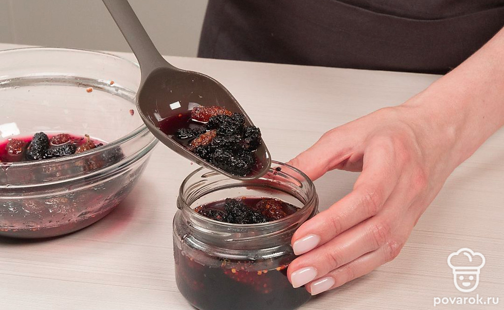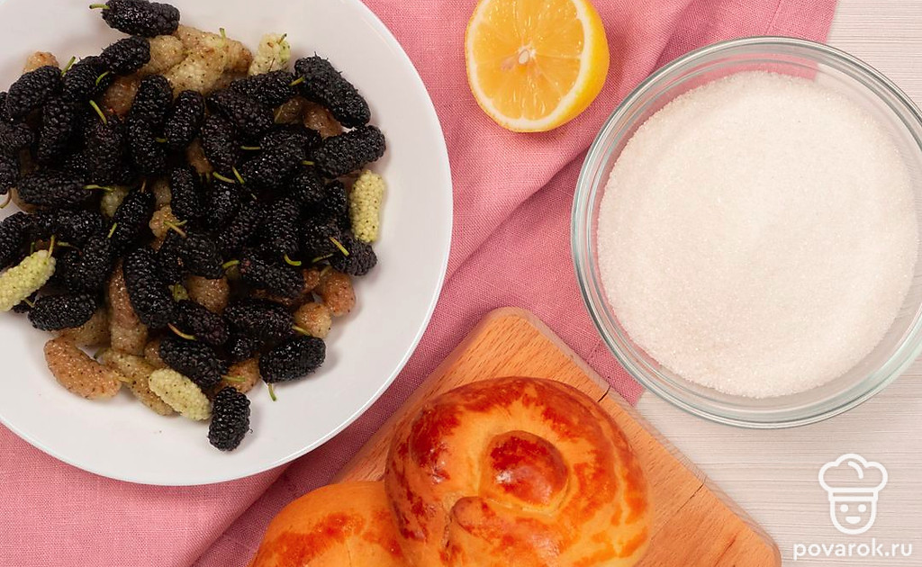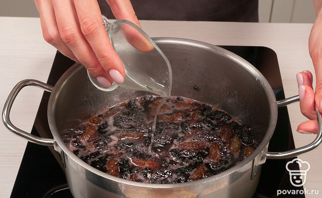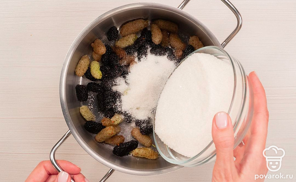 Заранее промойте шелковицу в дуршлаге, дайте лишней воде стечь, а затем аккуратно (лучше с помощью ножниц, чтобы не раздавить плоды) удалите плодоножки. Банки для консервации простерилизуйте на пару: наполните кастрюлю водой на две трети, сверху поместите подходящий по размеру дуршлаг и, когда вода закипит, осторожно поставьте в дуршлаг банки вверх дном. Обработайте банки паром в течение 15 минут на медленном огне, а затем дайте высохнуть.