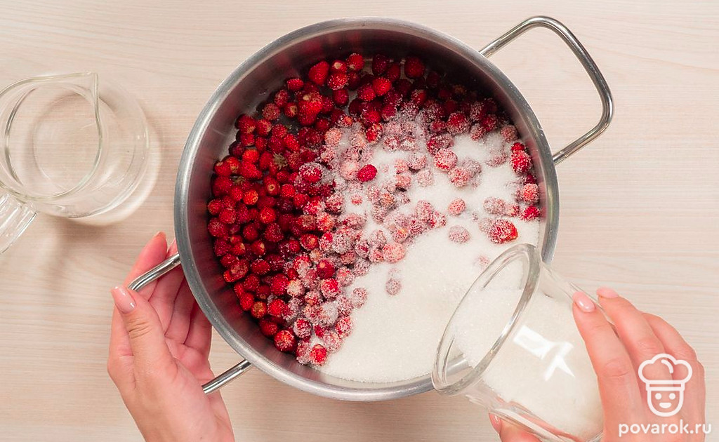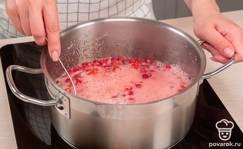 Начните варить варенье. Ягоды переложите в кастрюлю. Насыпьте сахар и налейте воду. Поставьте кастрюлю на средний огонь. Доведите до кипения, уберите огонь до минимума. Варите варенье 5 минут, постоянно помешивая ложкой. Выключите огонь, дайте варенью остыть.
