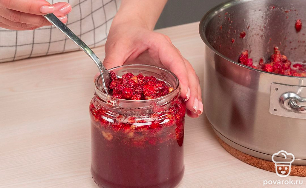Законсервируйте варенье на зиму. Разлейте горячее варенье в банки и закатайте крышки. Остудите варенье при комнатной температуре и уберите на хранение в темное прохладное место.