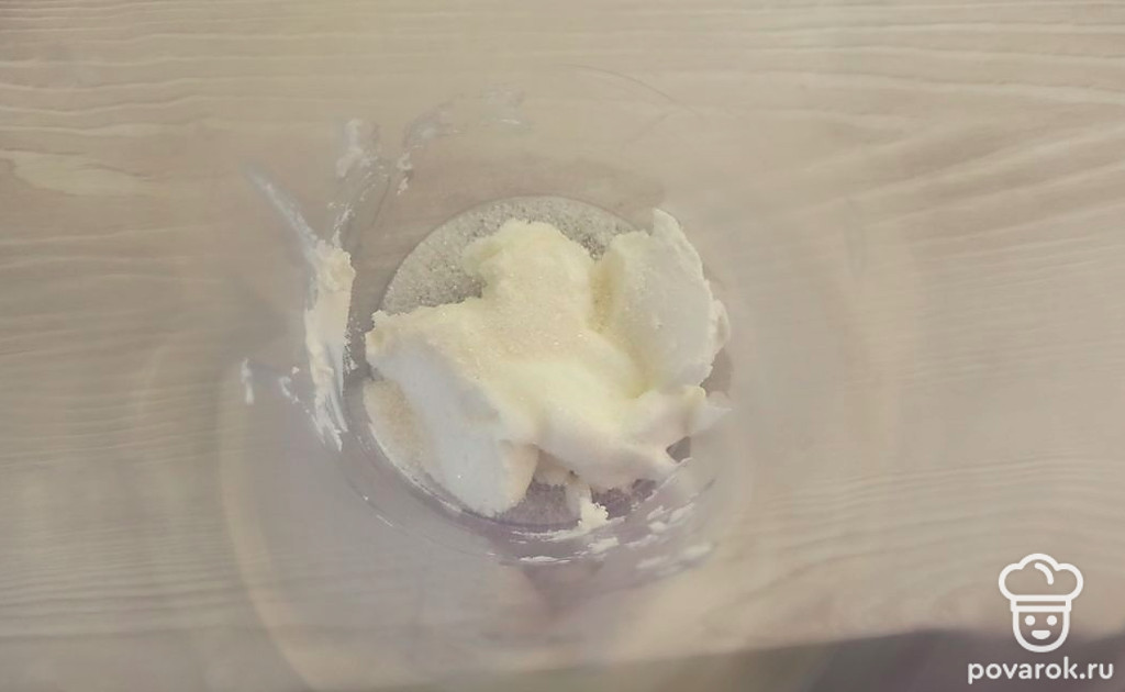 В чашу блендера выложите творожный сыр, сметану и сахар. Все взбейте венчиком несколько минут.