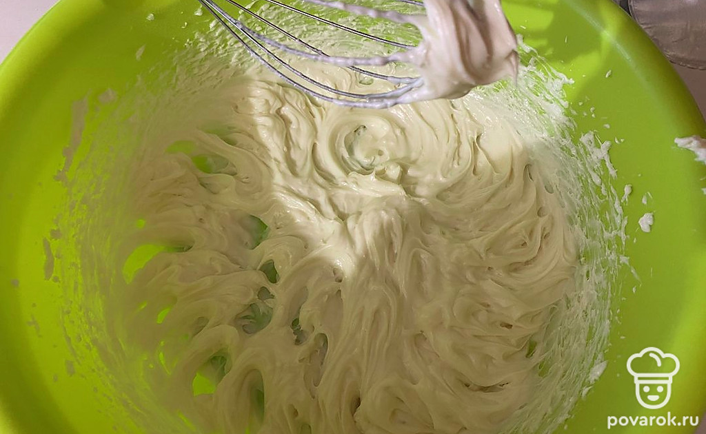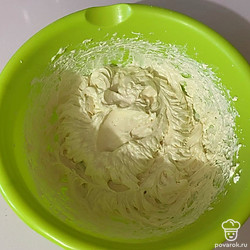 Каждый раз взбивая до однородного состояния. Важно, чтобы все продукты были комнатной температуры, иначе крем свернётся.