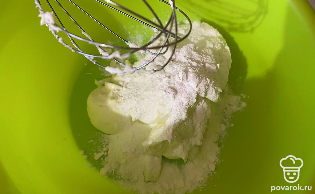 Сахарную пудру с творожным сыром соедините в миске для взбивания.