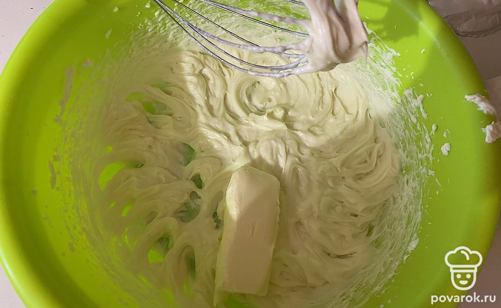 Затем частями добавляйте сливочное масло комнатной температуры.
