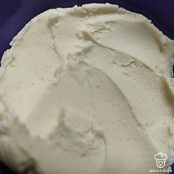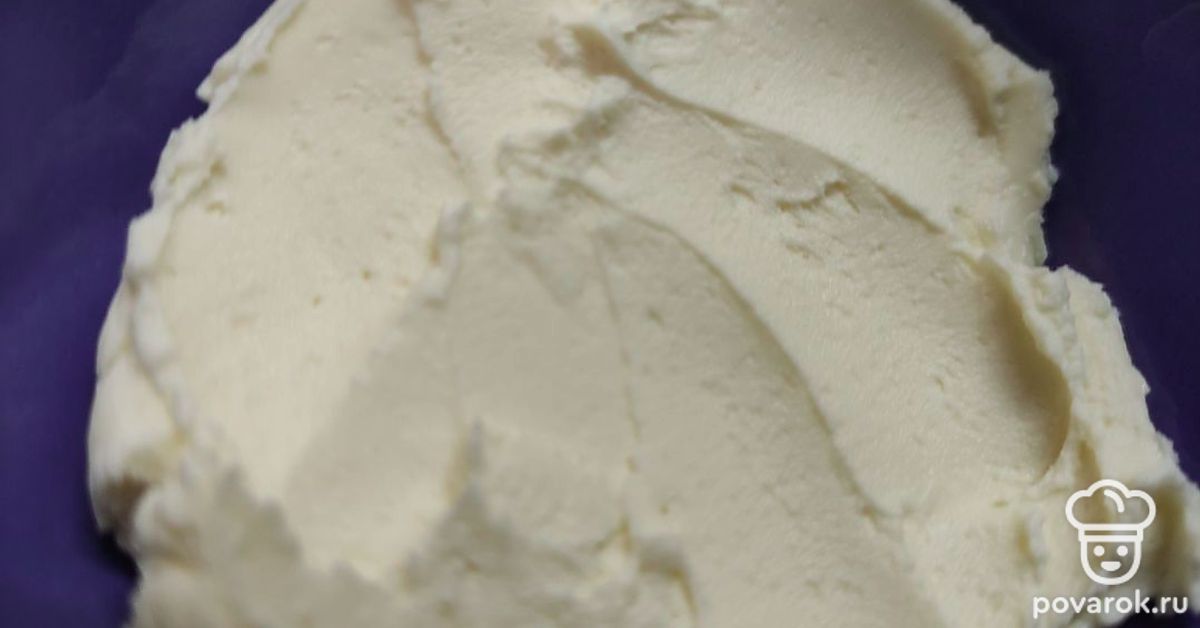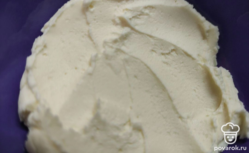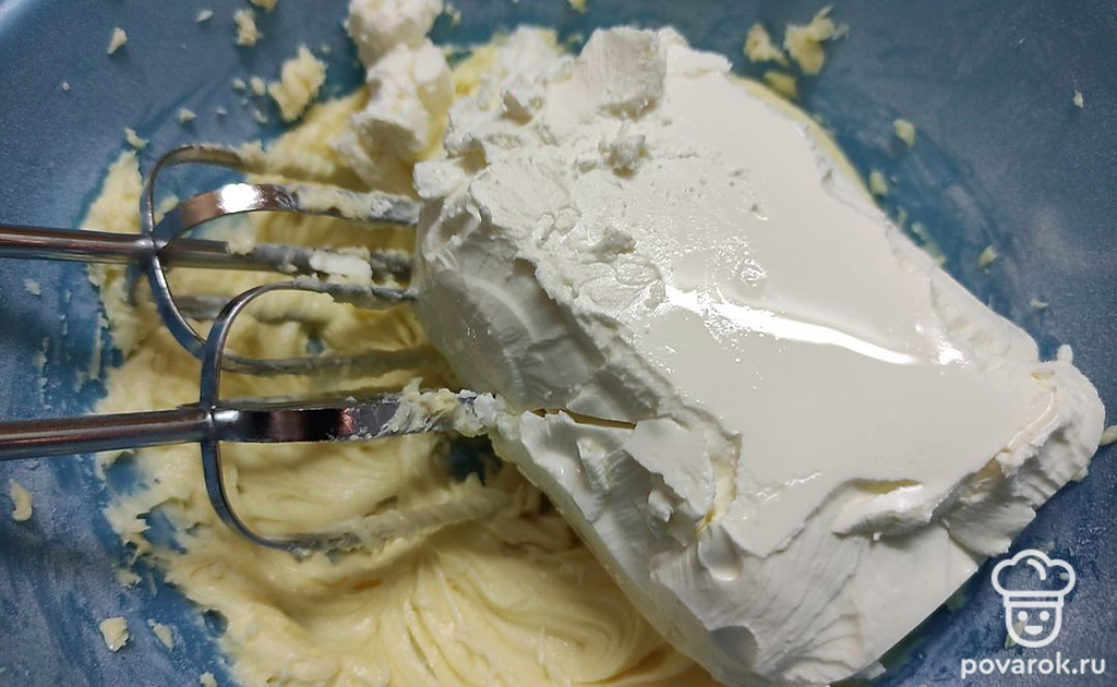 Добавить творожный сыр комнатной температуры, хорошо перемешать миксером до однородности и исчезновения комочков.