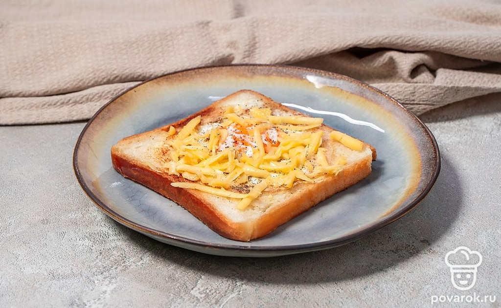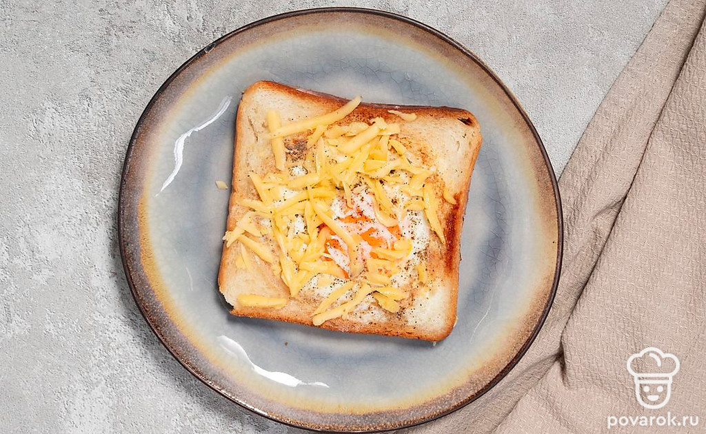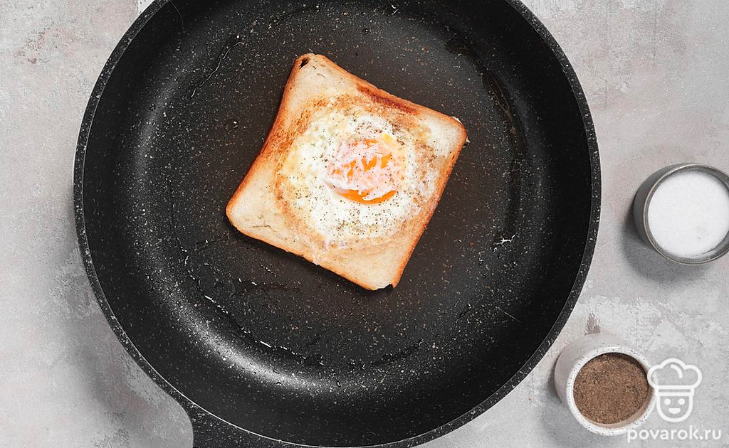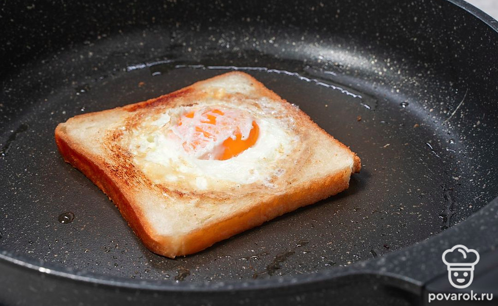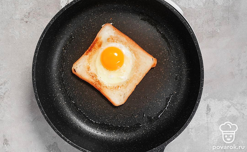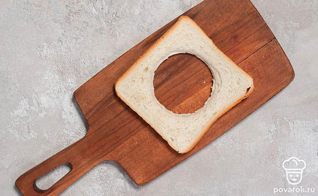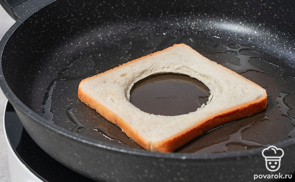 Кусок хлеба для этого рецепта желательно взять большой и толстый, чтобы яйцо не растеклось во время приготовления, а белку хватило места. Вырезать отверстие в хлебе можно абсолютно любой формы. Возьмите формочки для печенья и сделайте отверстие в виде сердца, звезды, елочки, цветка или просто круглое. Можете вырезать и обычный квадрат ножом. Не выбрасывайте сердцевину, а тоже обжарьте ее вместе с основным куском хлеба. Получится дополнительный вкусный тост, который можно намазать творожным сыром или маслом.