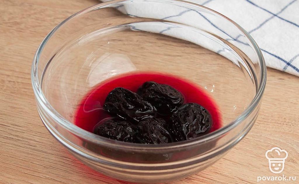 Выложите чернослив в небольшую миску и залейте вином. Оставьте чернослив настаиваться на 30 минут.