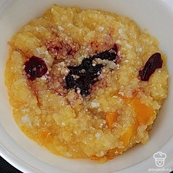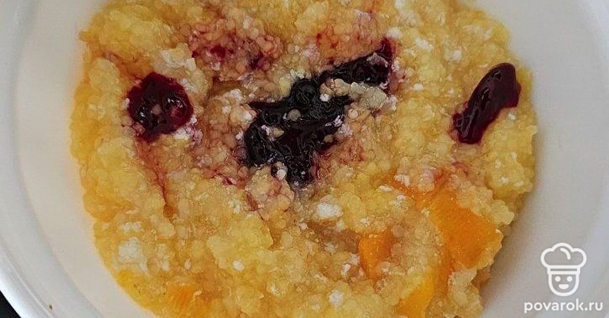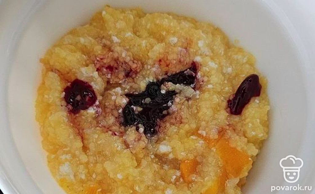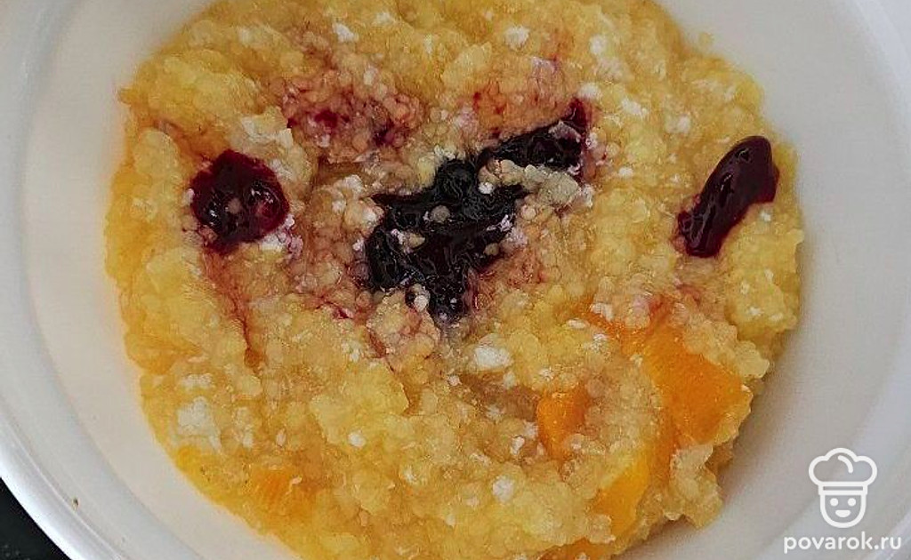 Готовую кашу переложите в тарелку. Добавьте варенье из смородины.