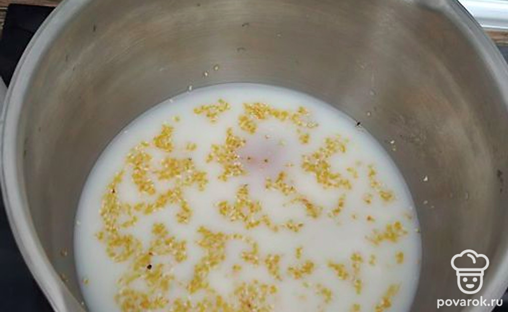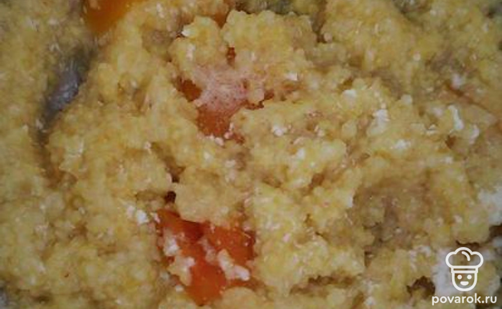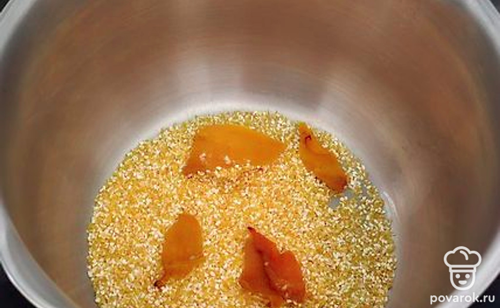Всыпьте кукурузную крупу, добавьте очищенную тыкву.