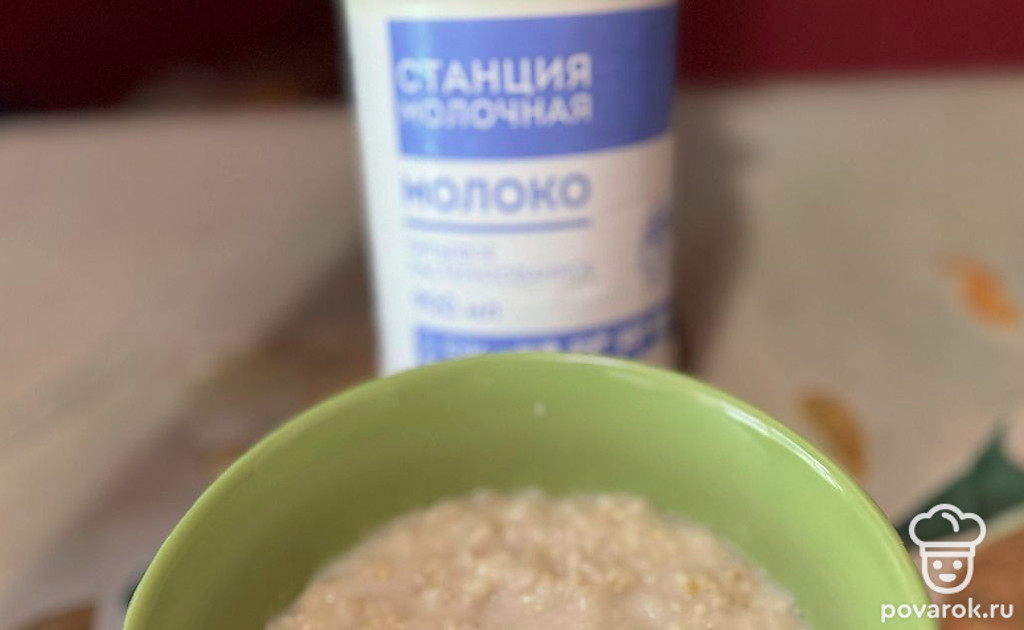 Когда овсянка начнет бурлить, влейте молоко. Так как овсянка без сахара, важно использовать вкусное молоко, которое не испортит вкус каши. Я использую молоко 2,5% жирности. Перемешайте, мощность плиты поставьте на минимум и постоянно помешивайте кашу.
