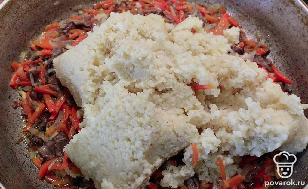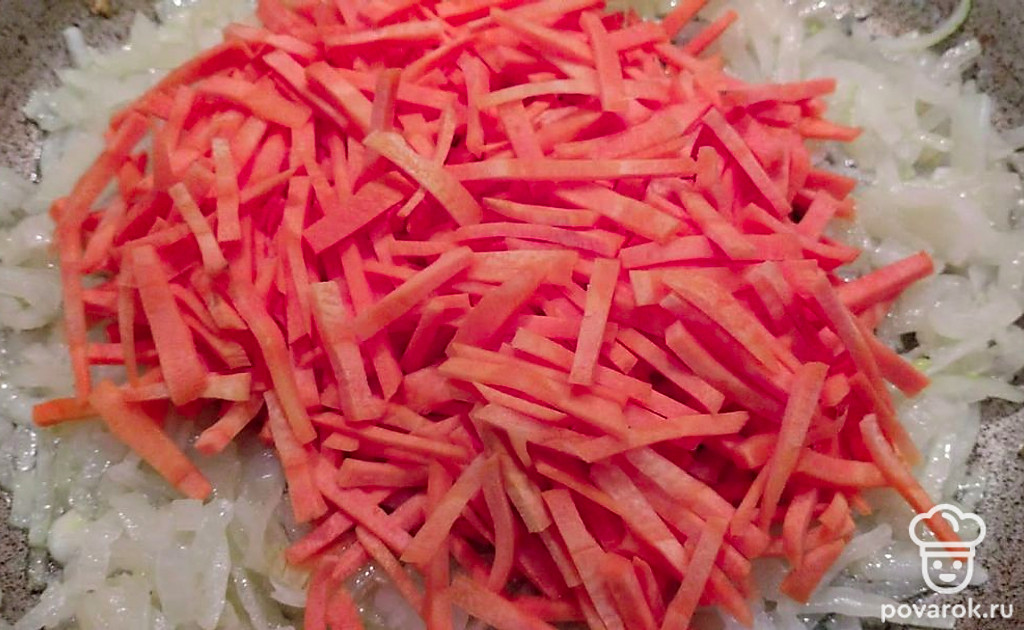 Нарезанный лук обжарьте на растительном масле 2 минуты. Добавьте измельченную морковь. Жарьте 3 минуты.