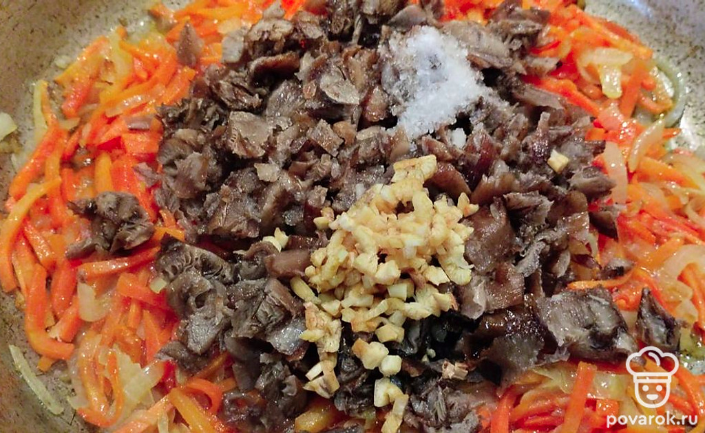 Выложите отварные грибы, нарезанный чеснок, соль. Томите 5 минут.