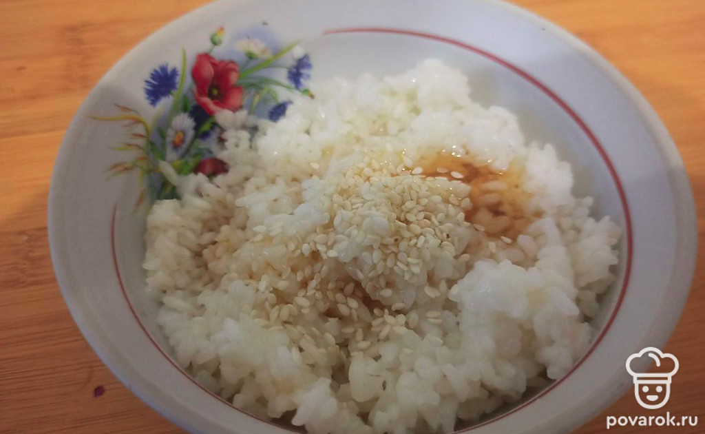 В приготовленный рис добавьте зерна кунжута и мед, хорошо перемешайте.