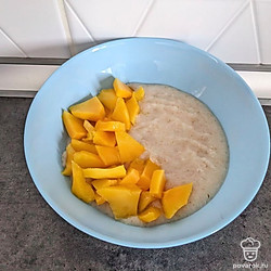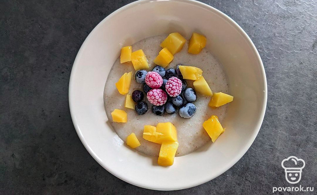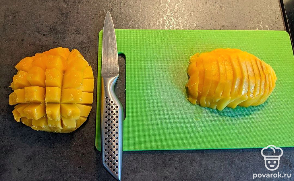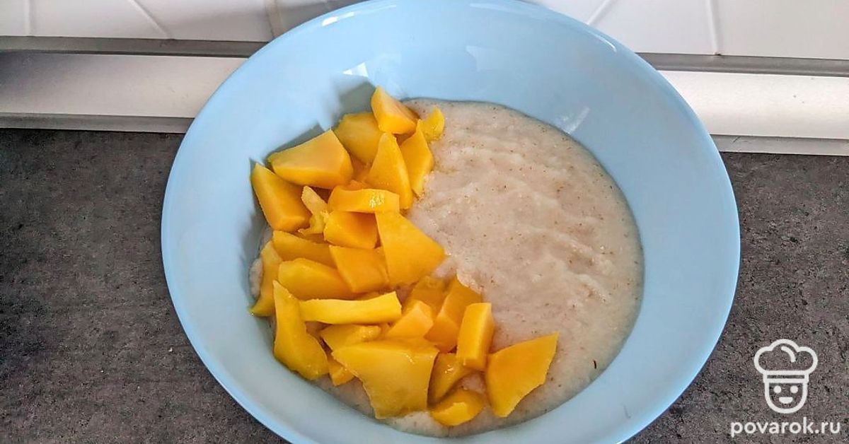 В это время помыть и нарезать манго. Можно очистить кожуру и нарезать кусочками, а можно сделать надрезы и вывернуть ежиком. В таком случае мякоть срезать лучше прямо в тарелку с кашей.