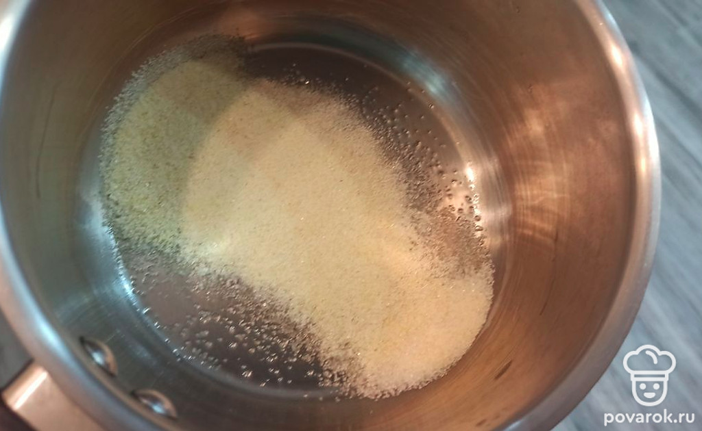 Манную крупу смешиваем с сахаром, заливаем водой и ставим на средний огонь.