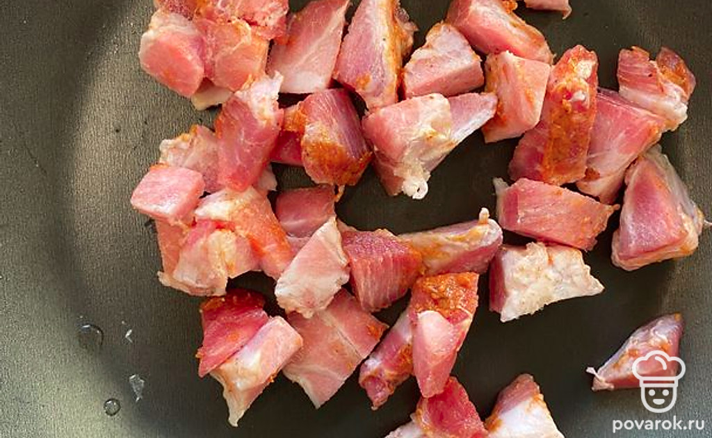 Мясо порежьте кубиками, добавьте паприку и соль.
