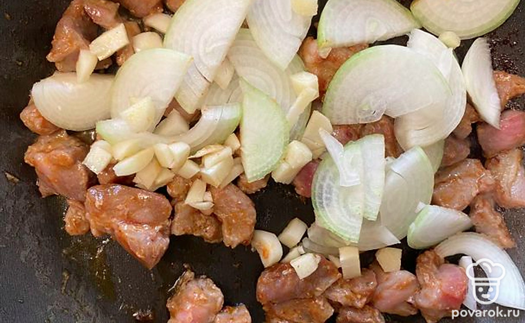 Лук и чеснок помойте, почистите и лук порежьте полукольцами, чеснок порежьте мелкими кусочками и добавьте к мясу.