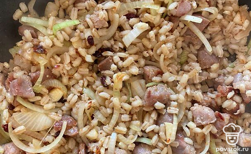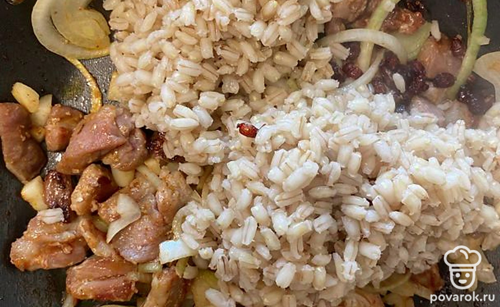 Добавьте уже сваренную перловую крупу и все тщательно перемешайте.