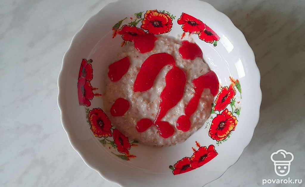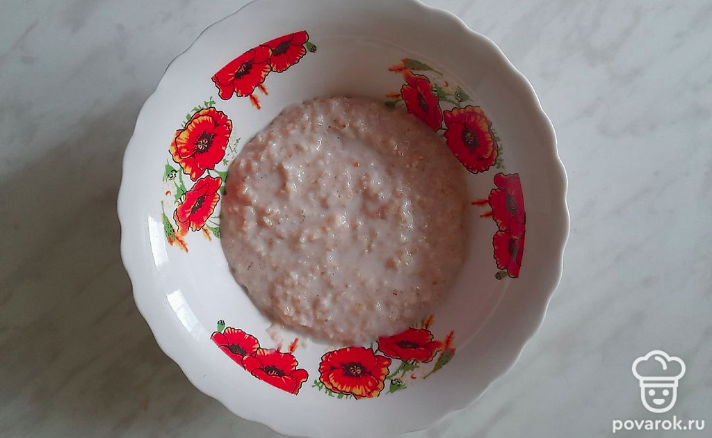 Перелейте молоко в кастрюлю и поставьте на огонь. Когда молоко закипит, убавьте газ, всыпьте овсяные хлопья и перемешайте.