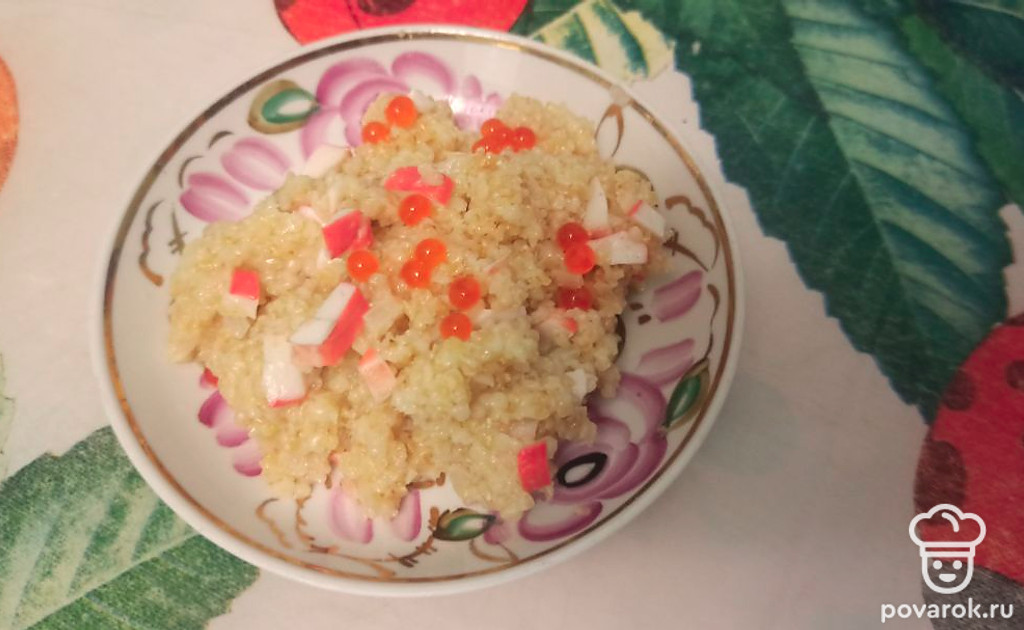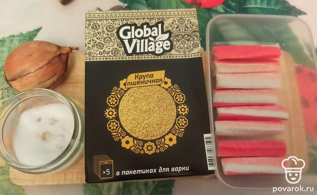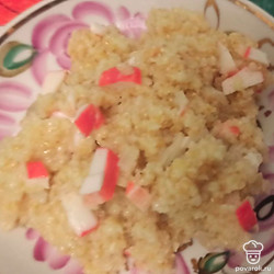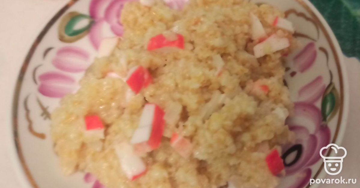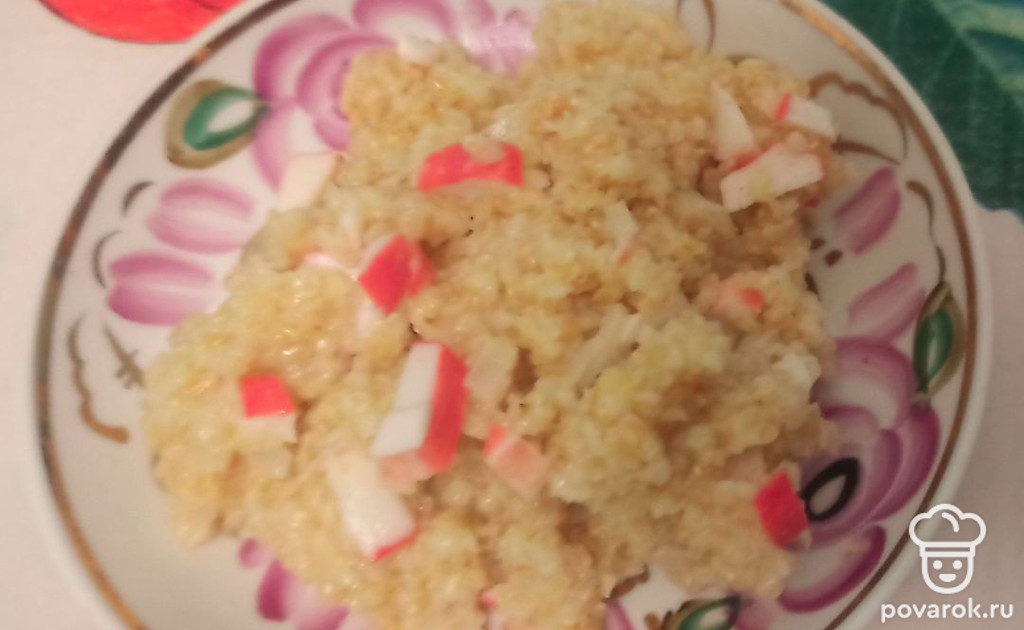 Пшеничная каша отлично сочетается с крабовыми палочками.