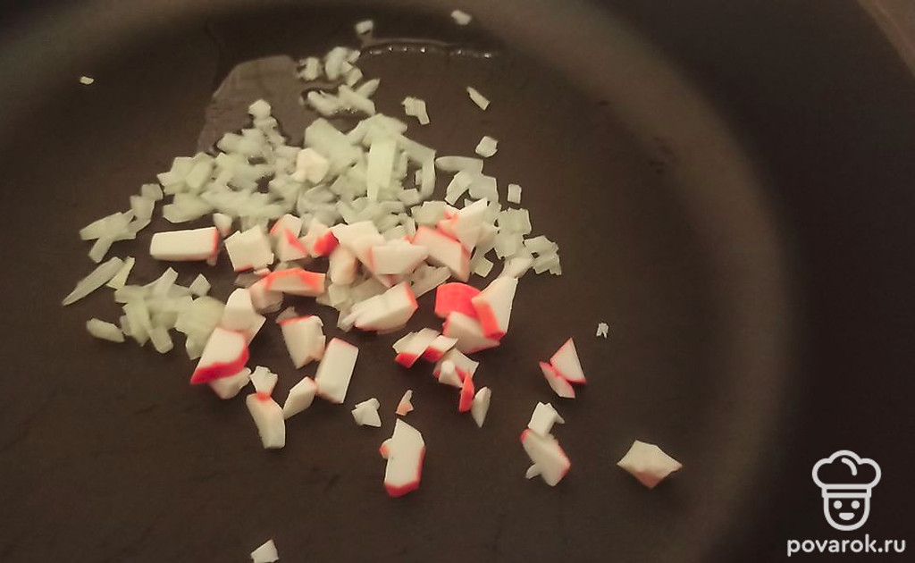 Репчатый лук и крабовые палочки мелко нарезаем и обжариваем на растительном масле.