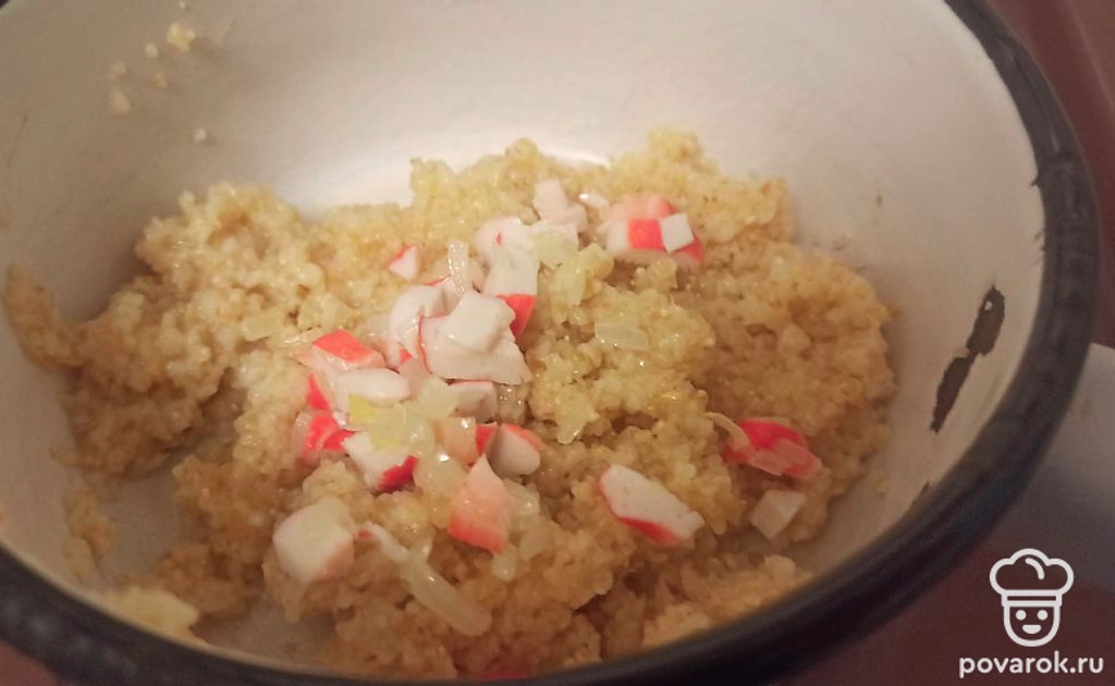 Далее смешиваем крабовые палочки и лук с пшеничной кашей.