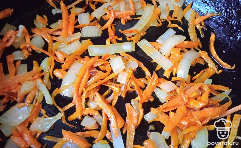 Обжарьте на сковороде, смазанной растительным маслом, нарезанный лук и натертую на терке морковь 5 минут.