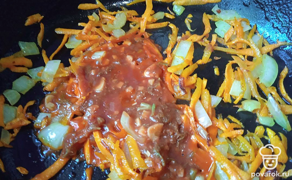Добавьте кетчуп и измельченный зубчик чеснока. Перемешайте. Тушите на медленном огне еще 5 минут.