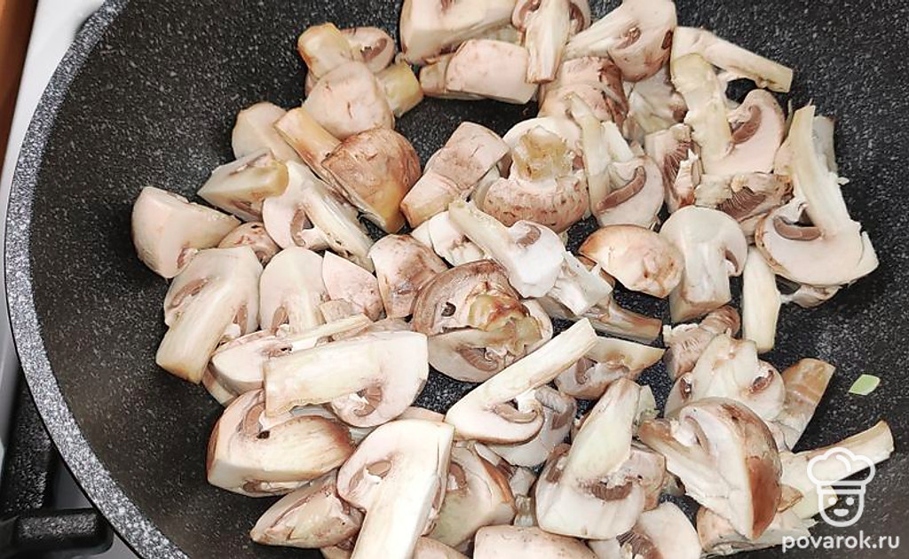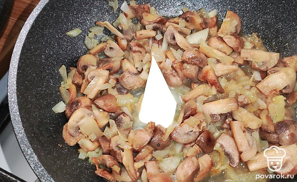 К грибам добавить сливочное масло. Оно придаст гарниру сливочный вкус.