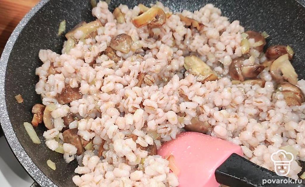 Соединить кашу с грибами. Обжарить несколько минут и подавать.