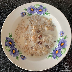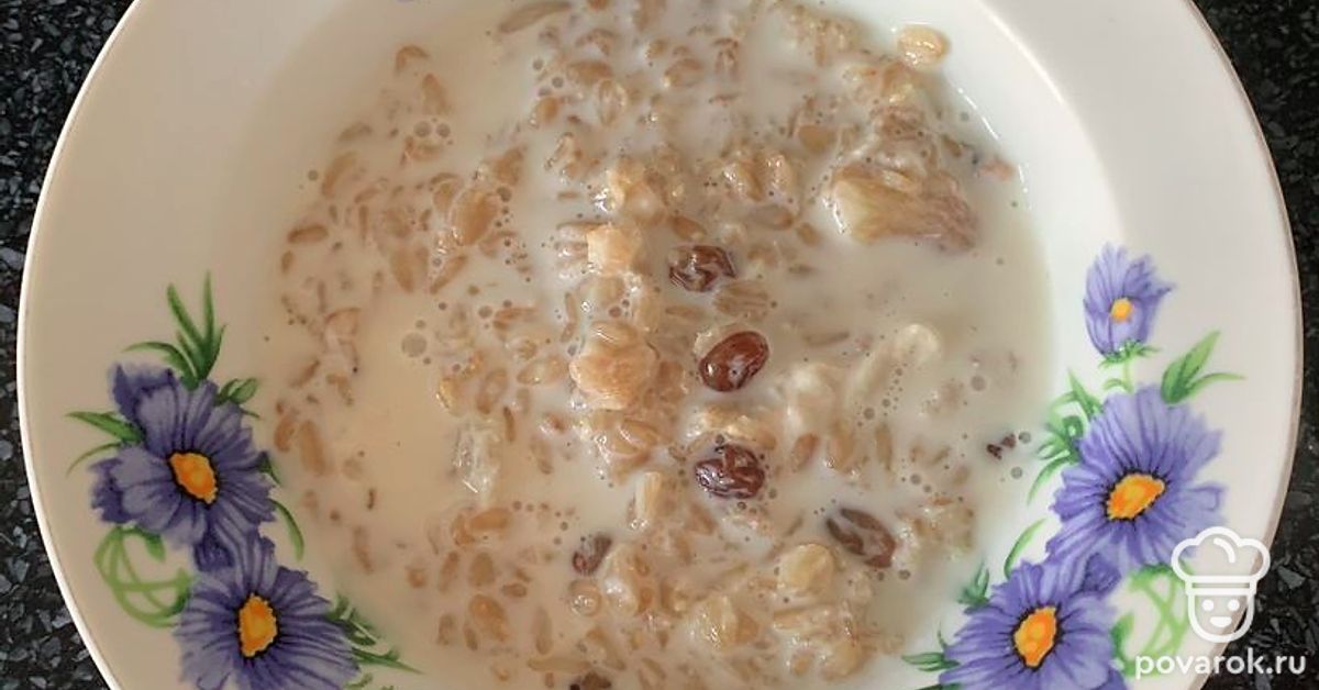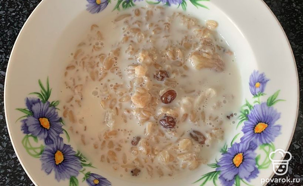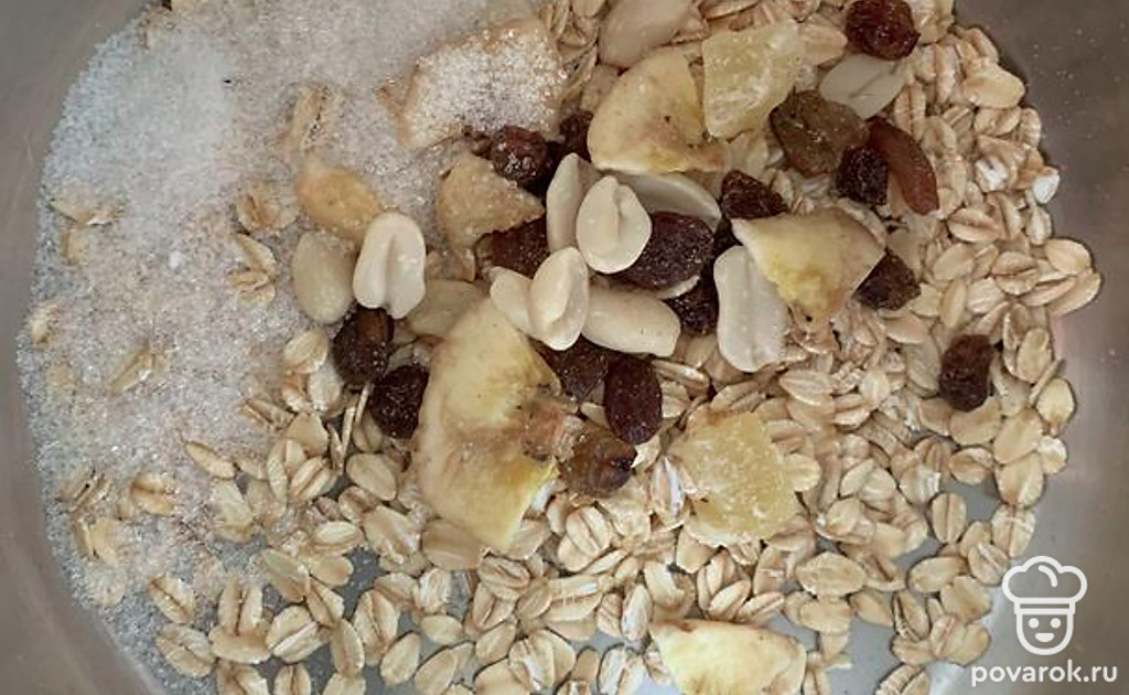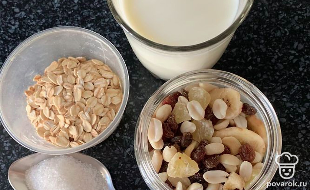 Смешать овсяные хлопья, сахар, цукаты, изюм и орехи. Залить молоком и довести до готовности.