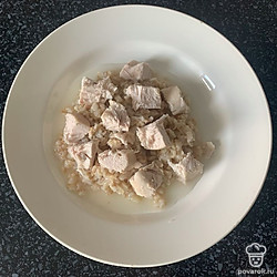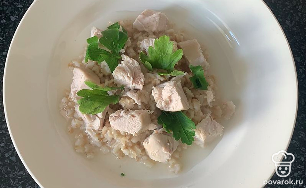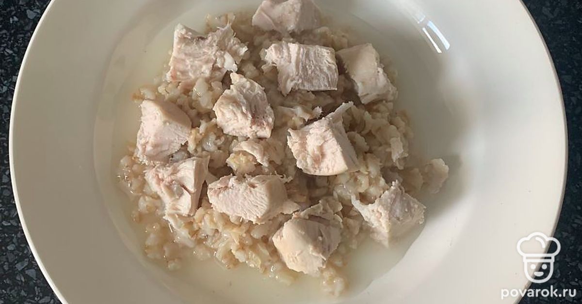 В кашу добавить сливочное масло и кусочки курицы. Перемешать.