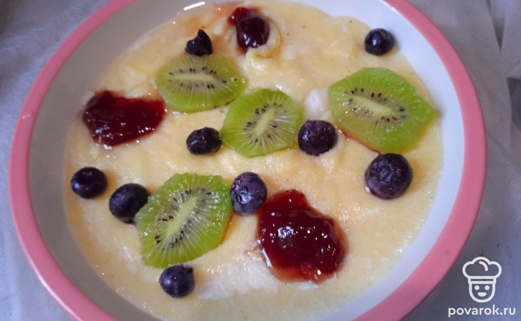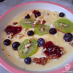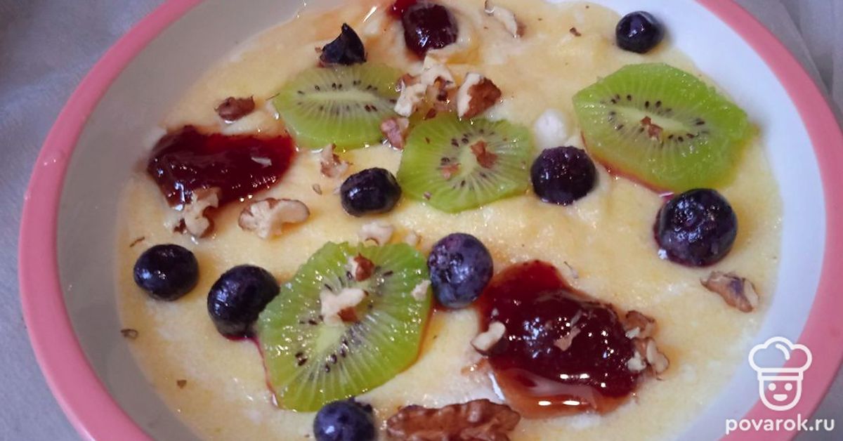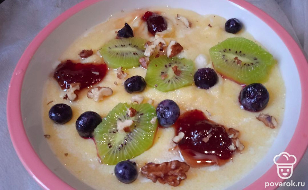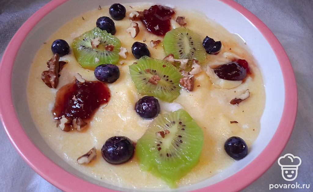 Молочная каша с полентой, клубничным вареньем, киви и голубикой