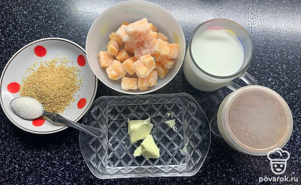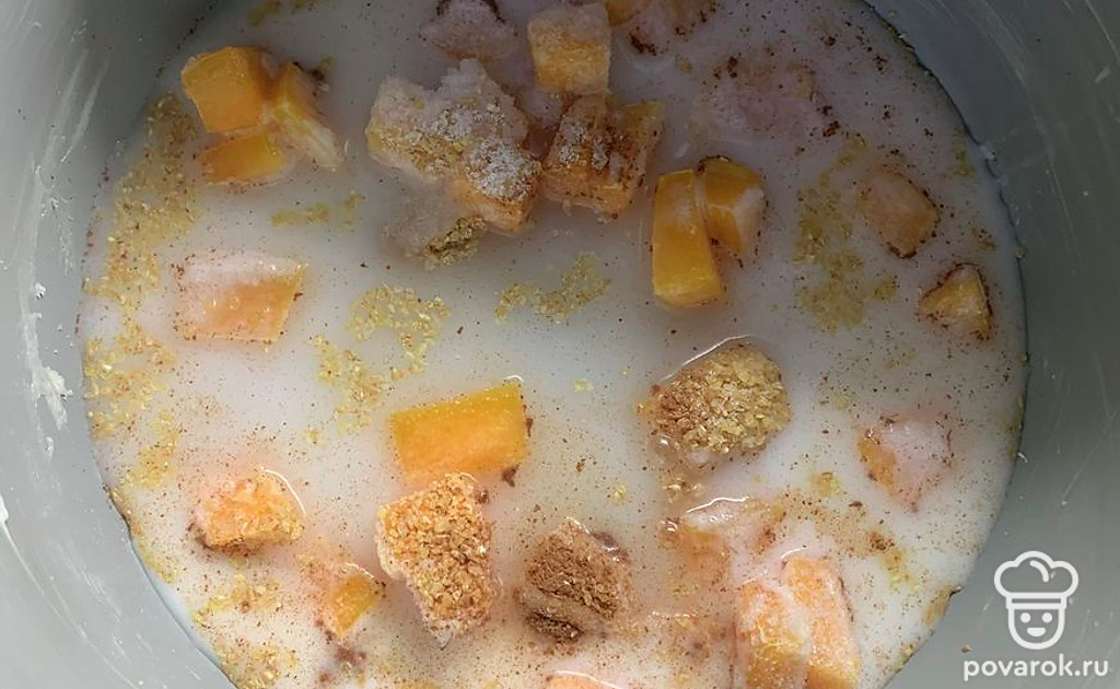 Выложить тыкву (у меня замороженная), пшеничную крупу, сахар, корицу, соль.