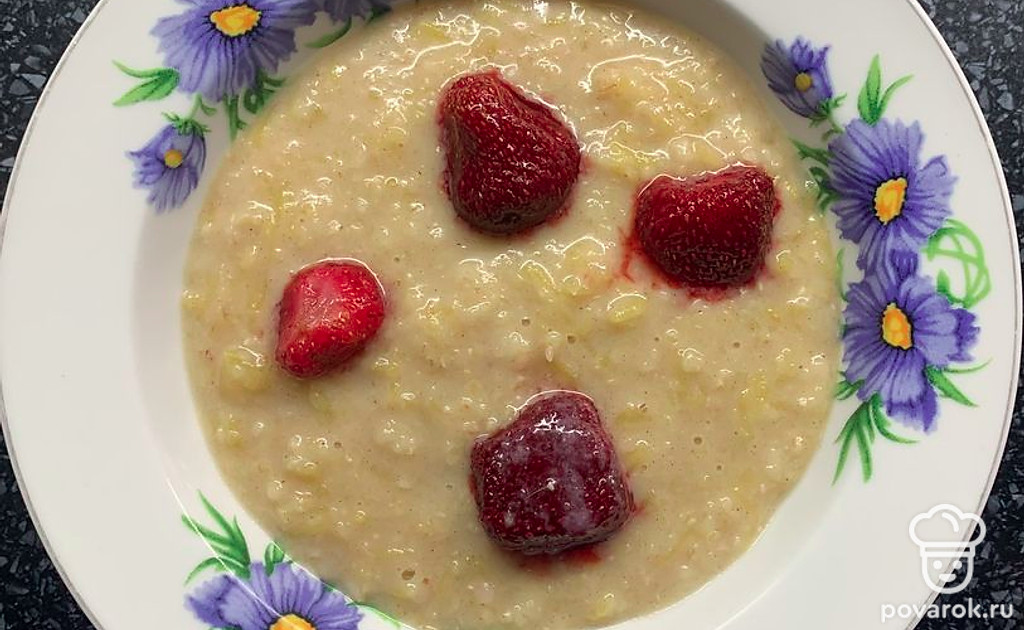 Залить молоком и поставить вариться на режим «Молочная каша» на 20 минут. Дать постоять на подогреве 20 минут.