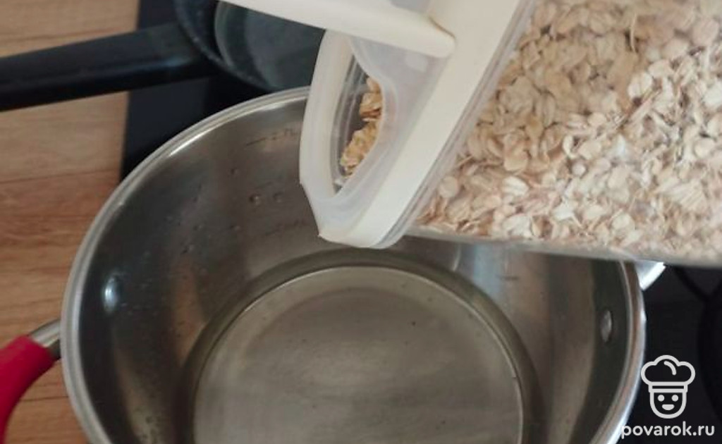 В холодную воду засыпаем овсяные хлопья. Если в хлопьях есть посторонние частицы, сначала их нужно промыть. Варим 5 минут на среднем огне.