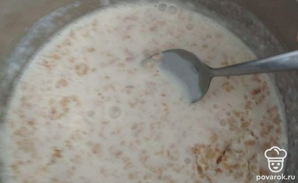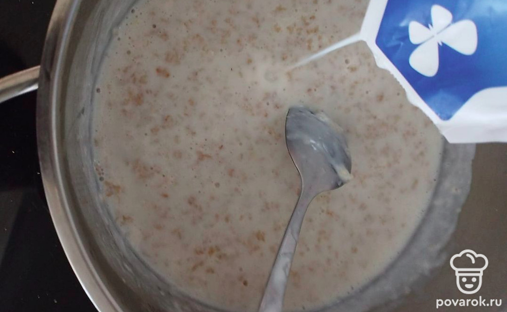 По прошествии пяти минут, когда хлопья разбухнут, вливаем молоко и варим еще 5 минут.