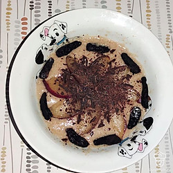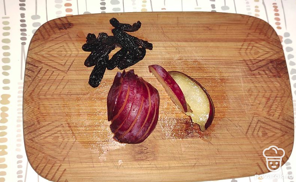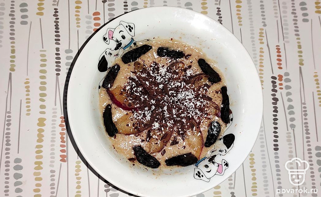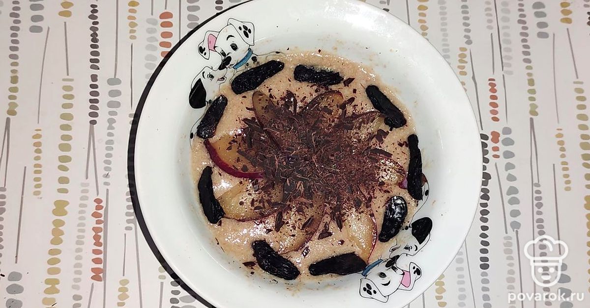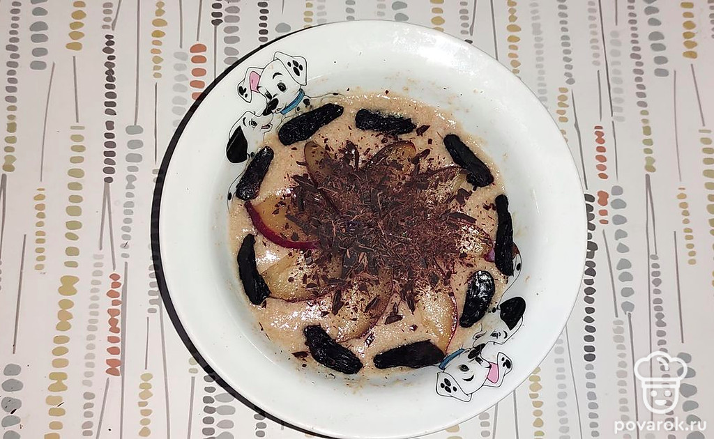 Помойте сливу и изюм. Сливу лучше использовать крупных сортов, спелую. Нарежьте ее на удобные вам кусочки. Потрите горький шоколад. Сливу, изюм и шоколад добавьте в тарелку с кашей.