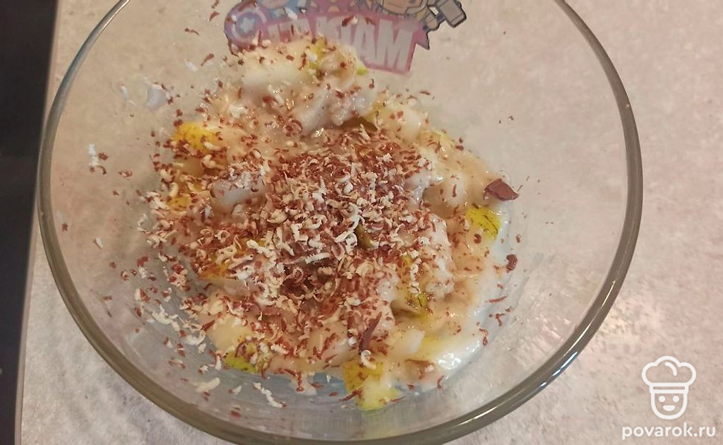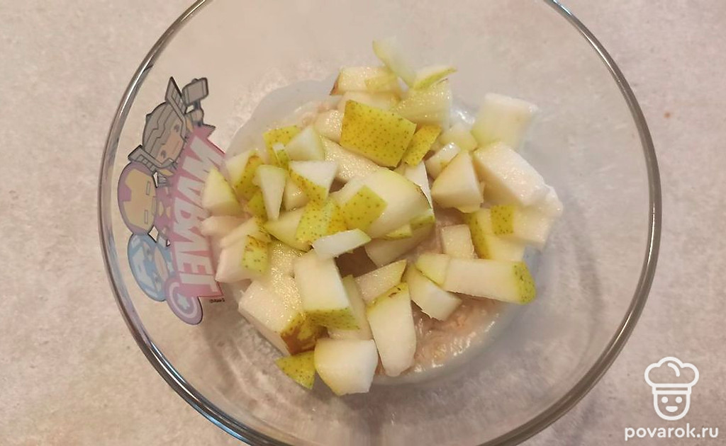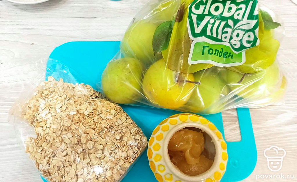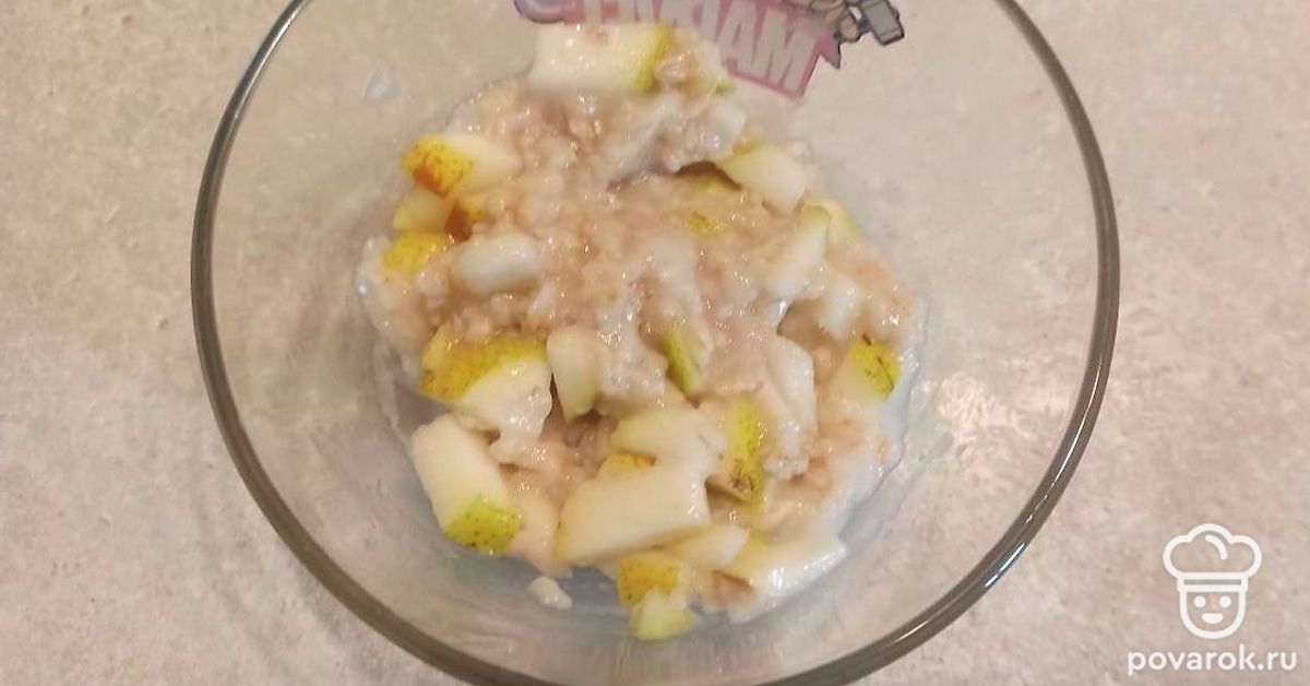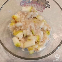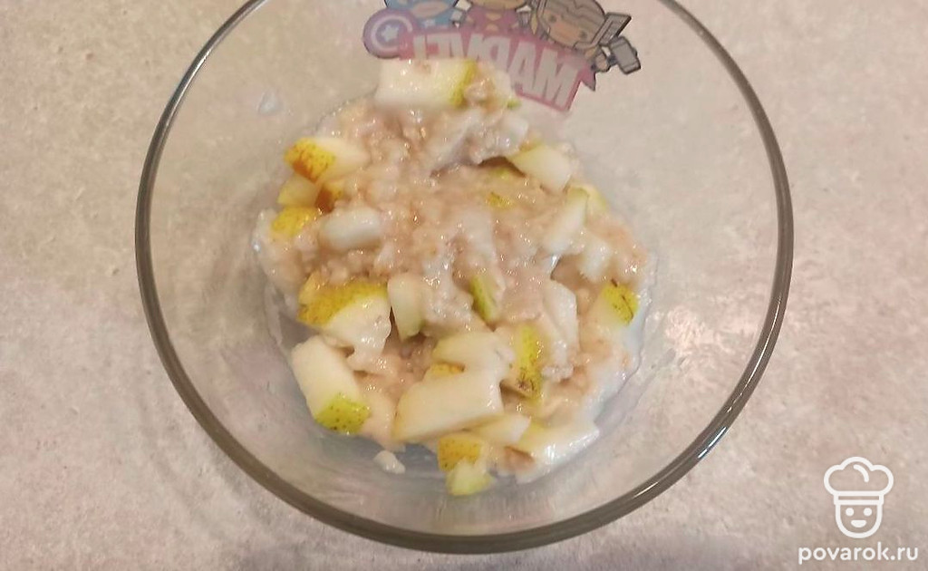 Добавьте в тарелку с кашей мед и яблоки, нарезанные небольшими кусочками. Перемешайте.