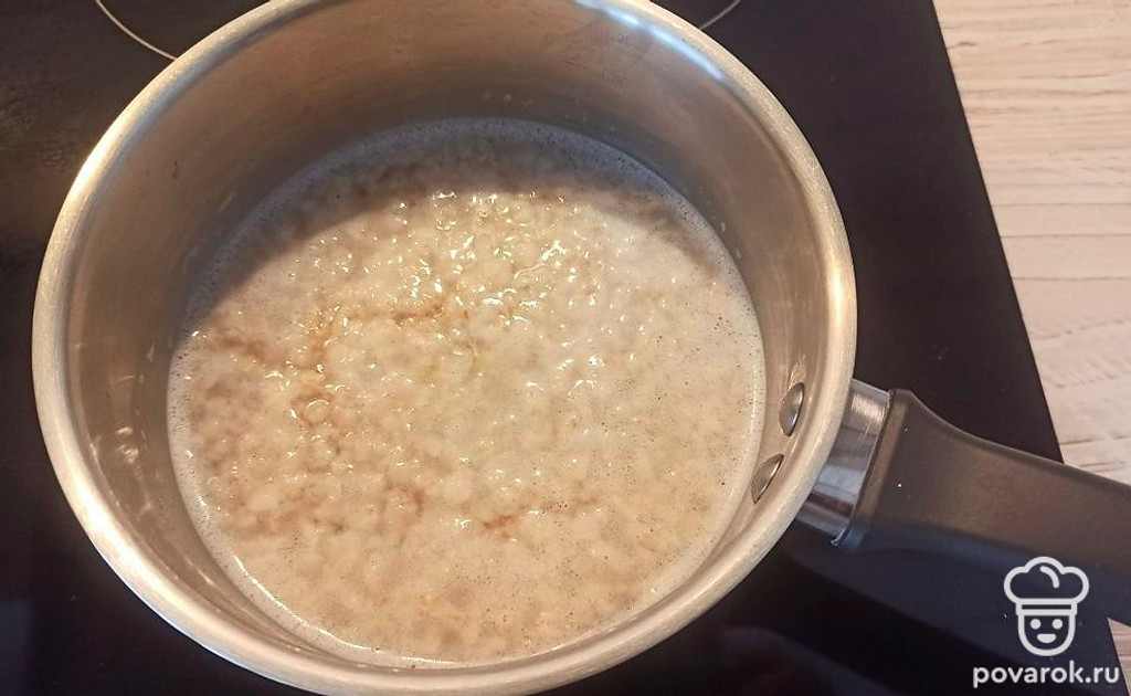 Овсяную кашу залейте водой в соотношении 1:2 (1 стакан каши и 2 стакана воды), поставьте на огонь и дождитесь готовности (15 минут).