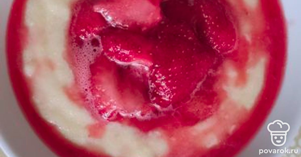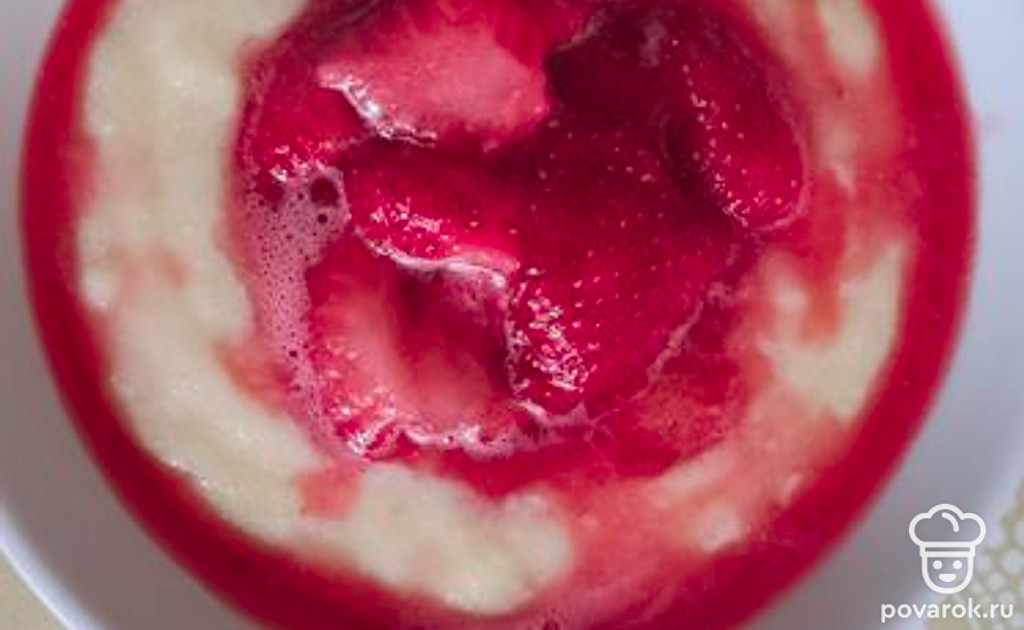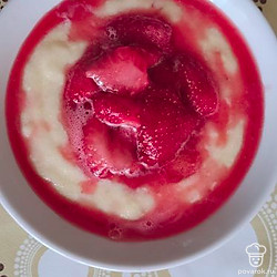 Выложить кукурузную кашу в тарелку. Сверху полить клубничным сиропом и разложить клубнику.