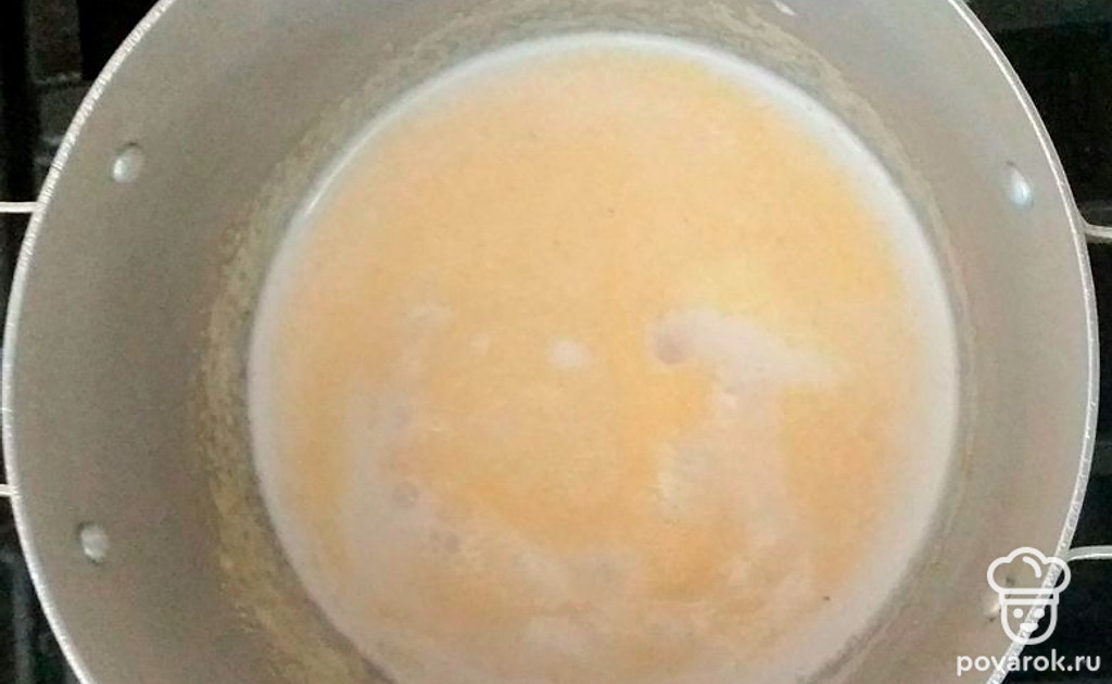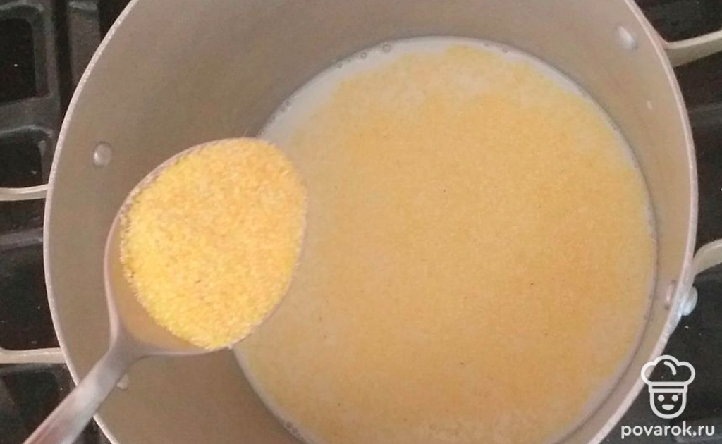 Молоко влить в кастрюлю, довести до кипения, немного посолить.Тонкой струей всыпать поленту, размешивая ложкой или венчиком. Добавить сахар, убавить огонь до минимального.