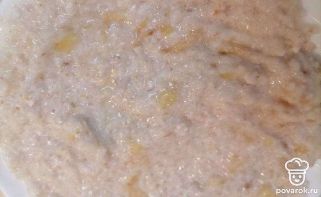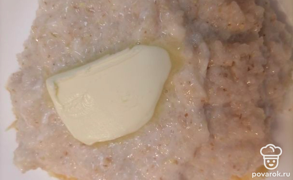 Сверху выложить кашицу, положить кусочек масла и перемешать.