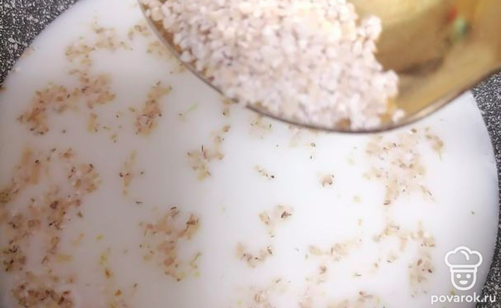 В молоко высыпать 4 столовые ложки крупы. Варить на медленном огне в течение 15-20 минут, периодически помешивая.