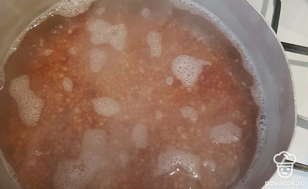 Налить в кострюлю воды, довести до кипения и добавить гречку, варить 15 минут на медленном огне, перемешивая, посолить.