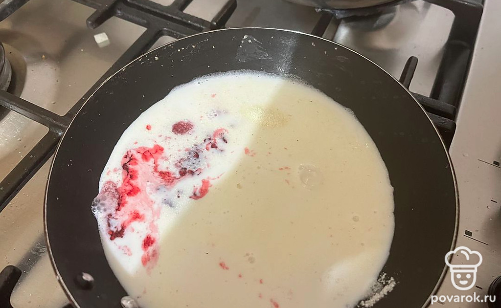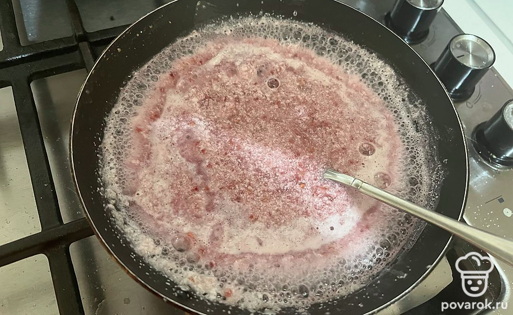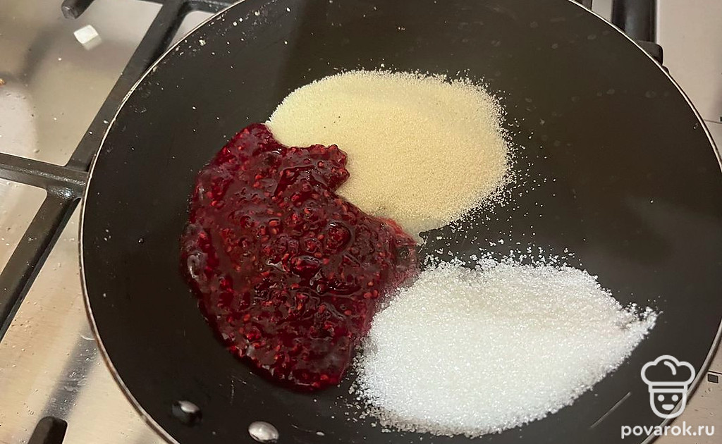 В сотейнике или сковороде соедините малиновое варенье, сахар и манную крупу.