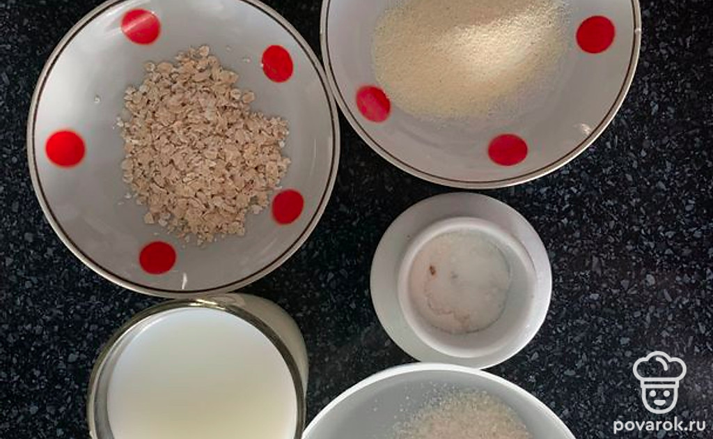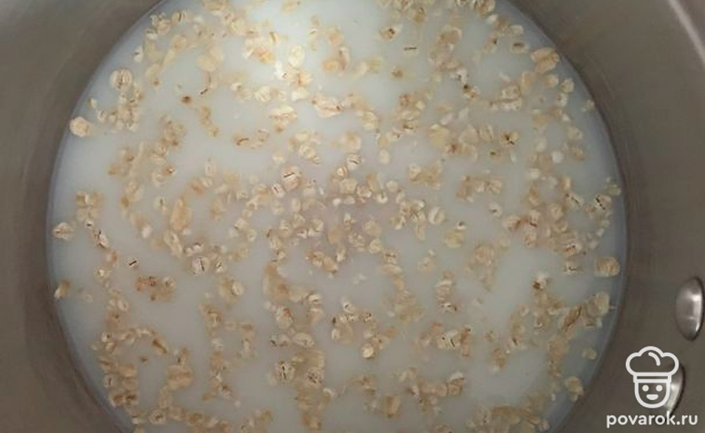 В молоко высыпаем овсянку и манную крупу. Добавляем соль и сахар. Варим до готовности.