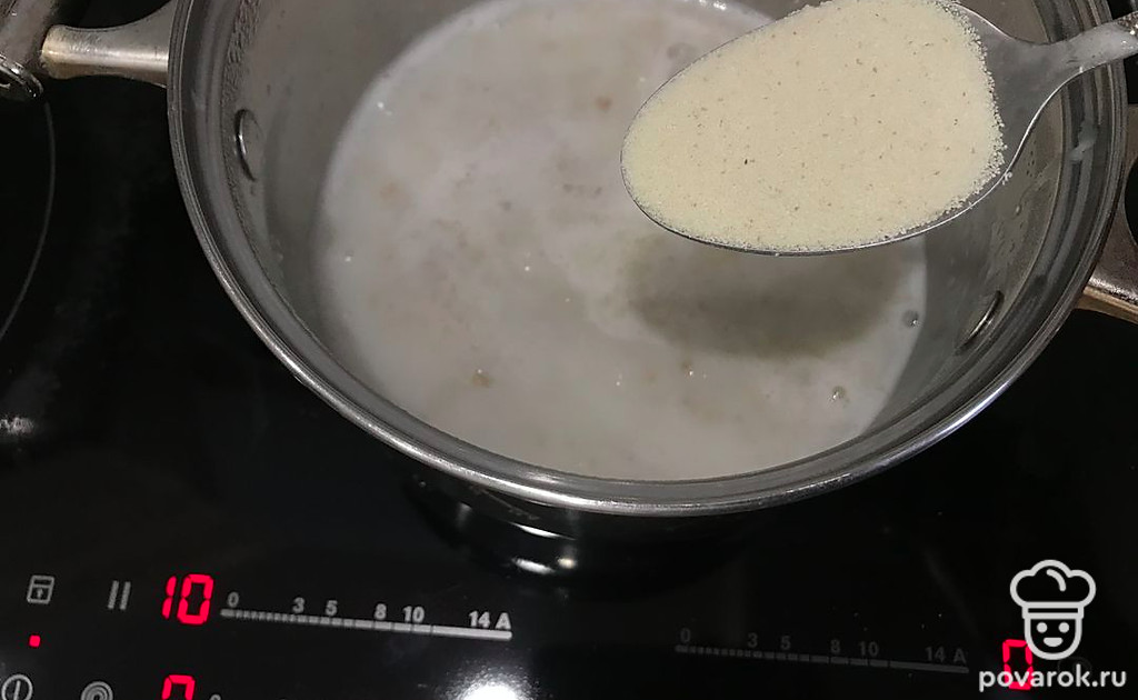 Затем добавьте 1 столовую ложку манной крупы и постоянно помешивайте, чтобы не было комочков. Добавьте соль и сахар по вкусу.